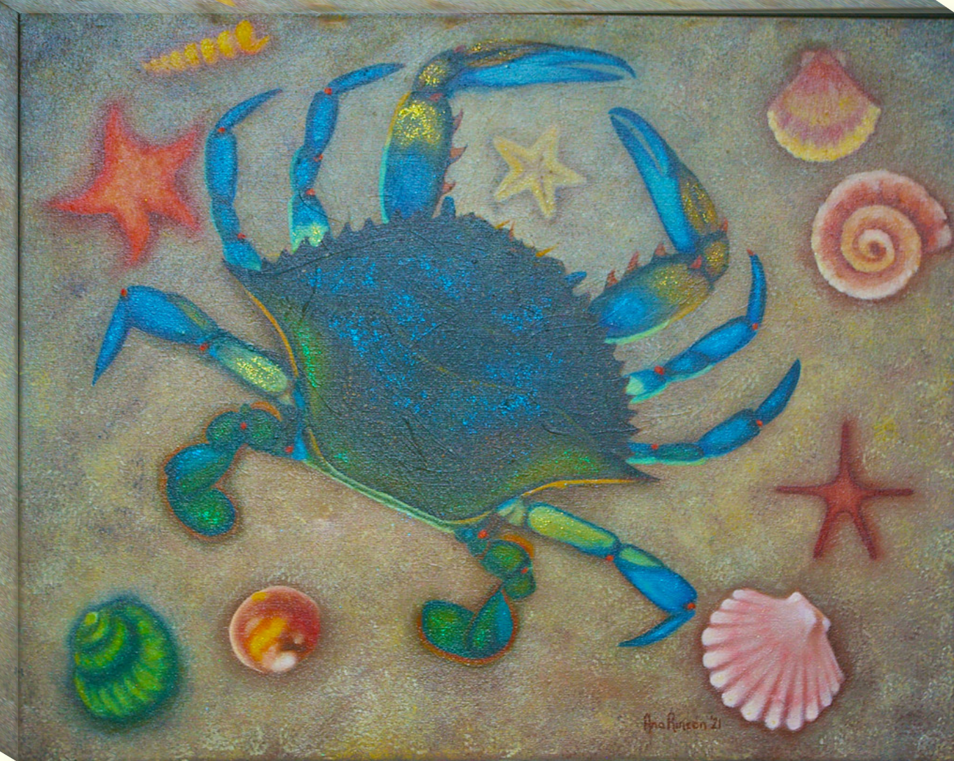 "Blue Crab" is a captivating oil on canvas artwork by Ana Luisa Rincon created in 2021. The piece beautifully captures the intricate details and vibrant colours of a blue crab, showcasing the artist's skill in conveying the textures of the creature's shell and the surrounding environment.