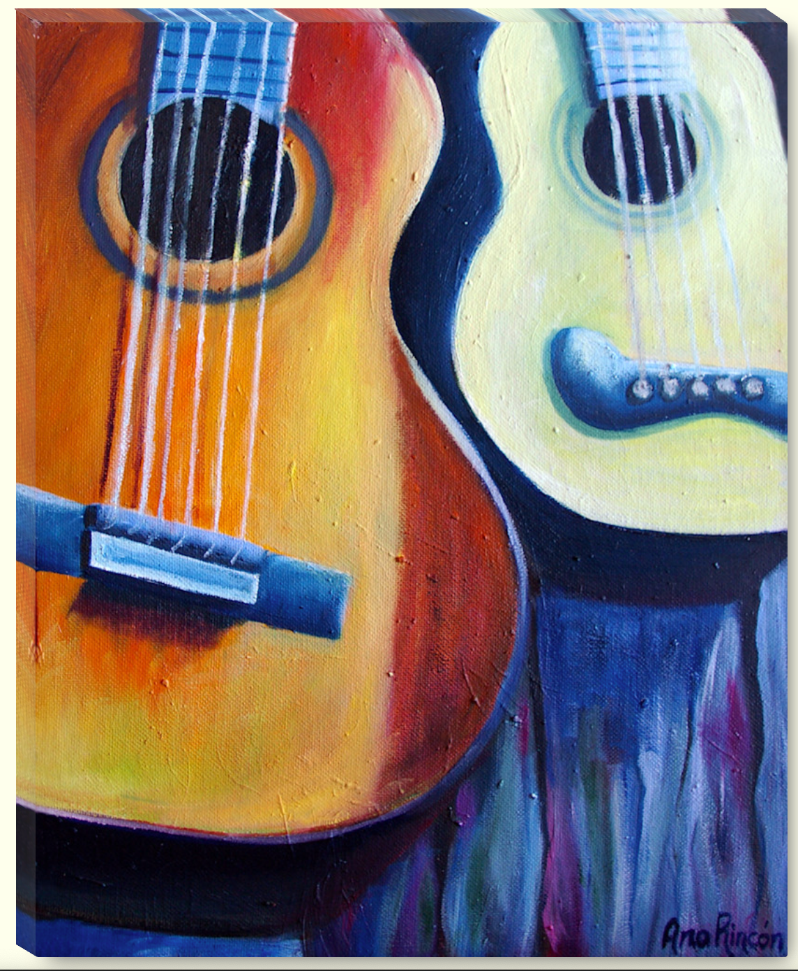 "Guitars" is a captivating oil on canvas painting created by Ana Luisa Rincon in 2007. The artwork beautifully captures the essence of music and creativity, showcasing an array of guitars with vibrant colors and intricate details.